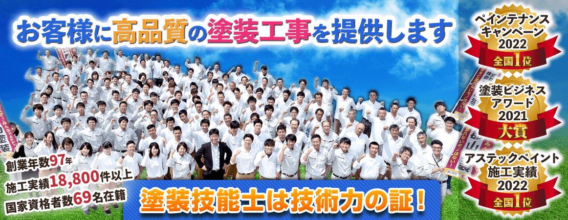 私たち、グループは創業97年、総勢190名を超える、自社職人・国家資格者が所属する塗装工事事業者です。マナーにこだわり、塗装品質にこだわり続けて、グループ全体で18,800件を超える外壁塗装、屋根塗装工事を行ってきました。