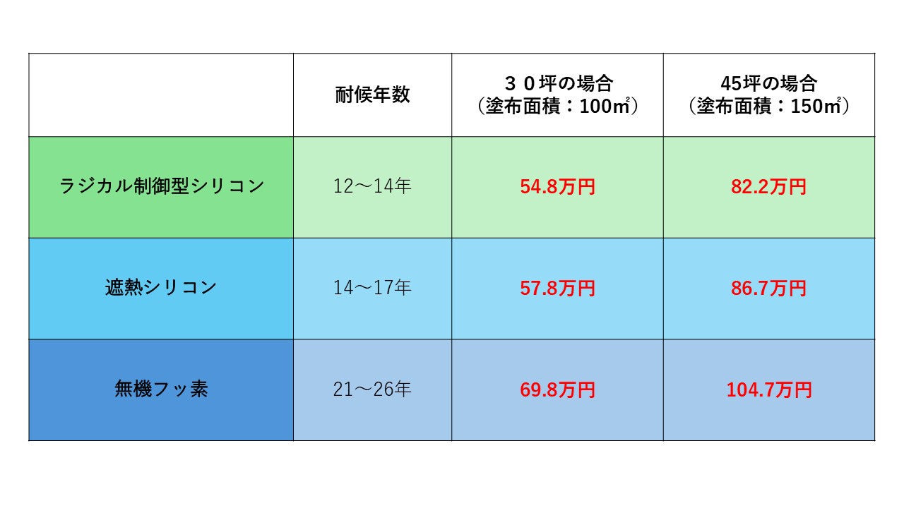 また、無機塗料など高耐久タイプを選べば初期費用は高くなりますが、20年以上持つものもあり、結果的に塗り替え回数を減らせるためトータルコストを抑えることができます。