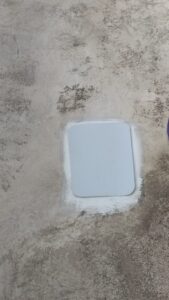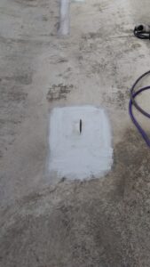 切り傷もシートについており、ここから雨水が侵入している可能性が高い状態でした。施主様とも相談し、今回とった対応策は応急処置となりますが、パッチ材で穴を塞ぐという内容でした。