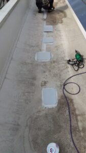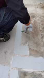先ずは専用の薬剤で、シート穴の周りを奇麗にします。補修に使用するパッチ材が付きやすくするための下地処理です。