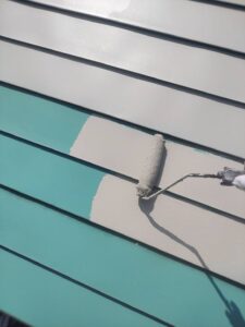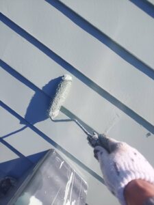 今回の屋根はガルバリウム鋼鈑でしたので、より密着力が高い、二液の金属専用のエポキシ系錆止め材を全体に塗布しました。