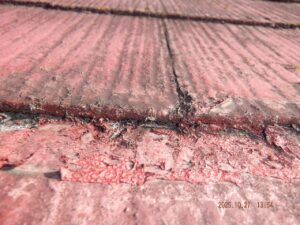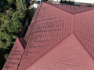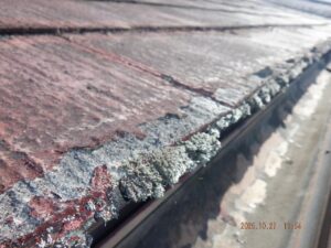 ※写真は勾配が緩やかな2階建ての屋根の写真です。10年前に塗装された際に足場を使わず施工した為、危険度が高い屋根の端部は洗浄不良で密着力が弱く、1枚目の写真の様に塗膜が剥がれ、苔がびっしり着いておりました。