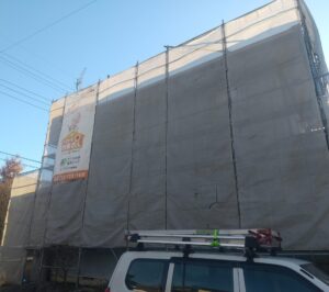 また、足場に飛散防止シートを設置することで、塗料のにおいや高圧洗浄時の水しぶき、塗料の飛び散りを防ぎ、近隣住宅への配慮にもつながります。