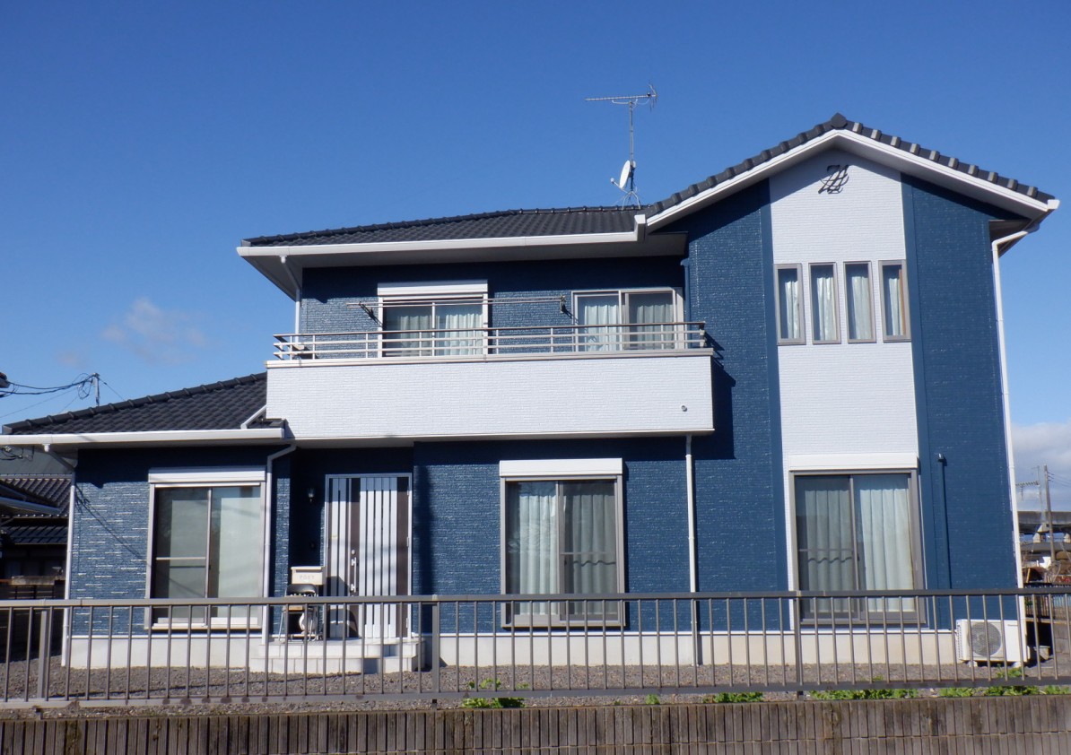 外壁は「マウンテンブルー」と「クールグレイ」という色で塗装しました。濃いブルーを基調とし、青みがかった薄いグレーを組み合わせたことで、爽やかさと重厚感を両立した、洗練された外観に仕上がっています。
