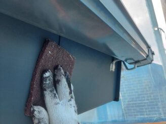 破風・樋の下地処理です。表面を削り、塗膜の密着性を高めます。